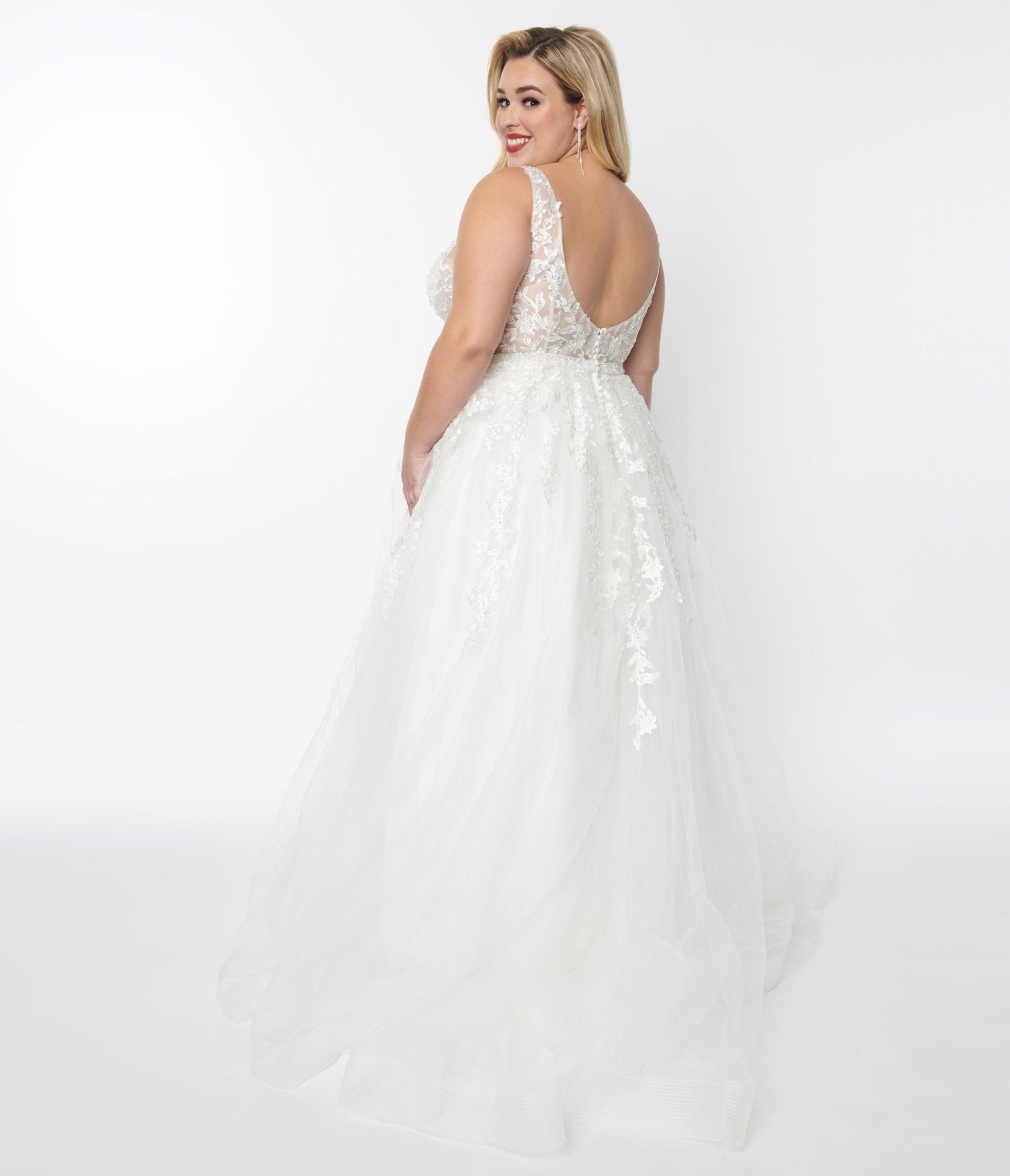 Plus Size Ivory Floral Lace Tulle Wedding Ball Gown Unique Vintage